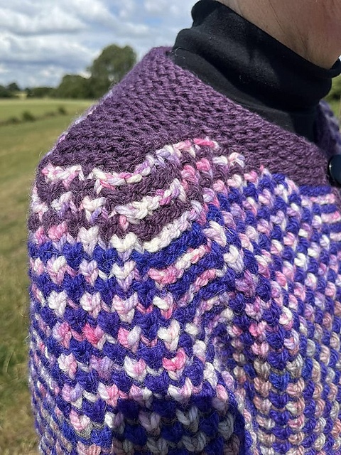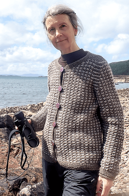 Denne cardigan er designet til at sidde løst, så den kan bruges over en tynd sweater. Den stribede tekstur laves ved at veksle mellem striber i grundfarven og kontrastfarven. Teksturen kommer af masker, der samles op længere nede på en retstrikket baggrund. Der laves sadelskuldre i toppen af raglansømmene.