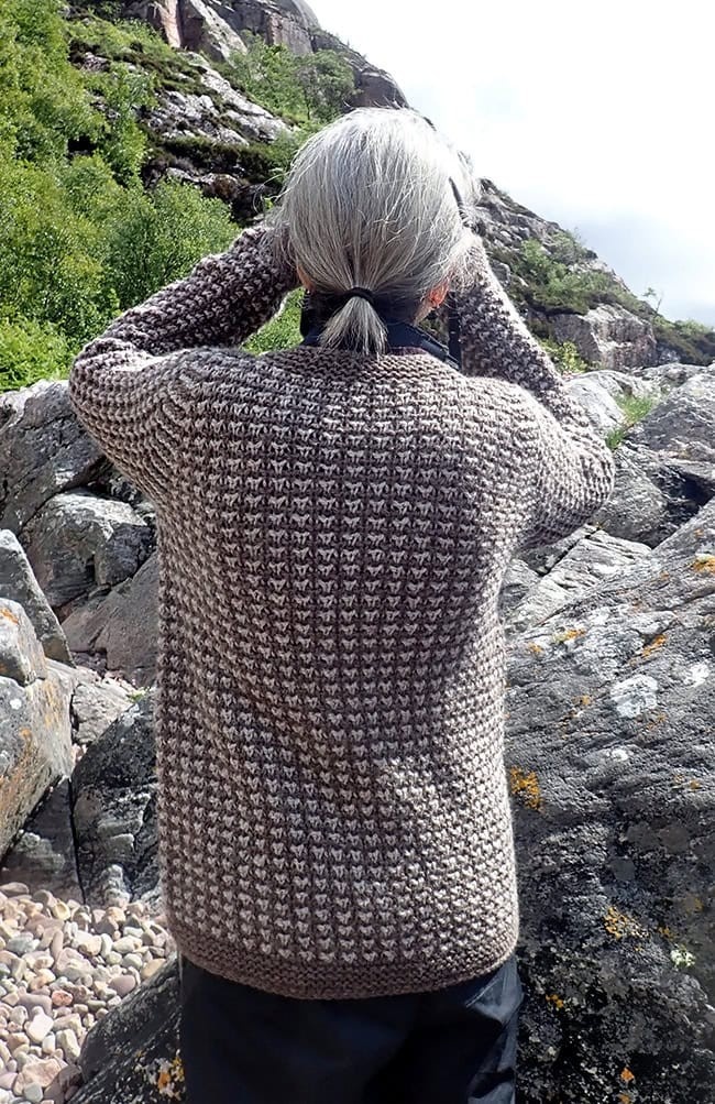Den tofarvede (lysegrå og mørkegrå) cardigan er strikket i Cascade Yarns Ecological Wool, som er 2-ply chunky.