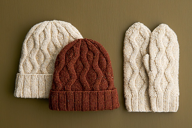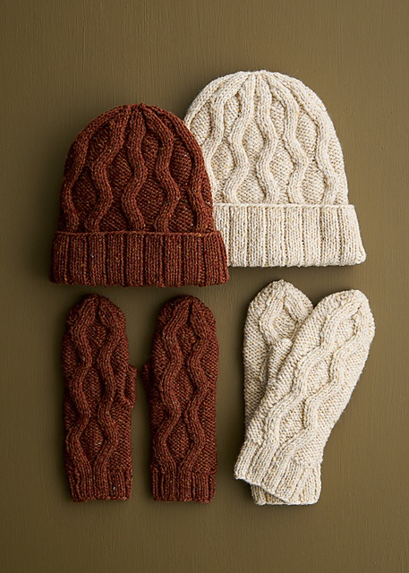 | Skønt sæt med hue (4 størrelser) og vanter (3 størrelser) med snoningsmønster, der ligner dyrespor. Fra baby til stor voksen. Her i 100 % uld på pinde 4 og 5 mm. |