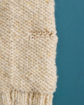 - Næste omg: Strik vr til første markør, flyt markør, 4 vr, (3 r, 3 vr) x 2, flyt markør, strik vr omg ud.