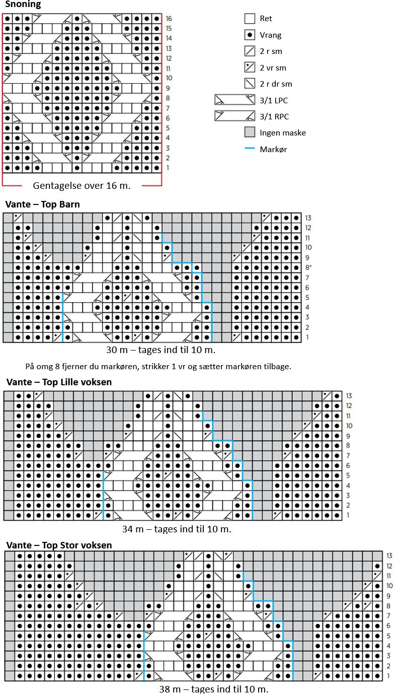 Bemærk: Strik instruktioner til højre hånd til den ene vante og til venstre hånd til den anden. Begge passer med omg 13 af diagrammet ml markørerne.