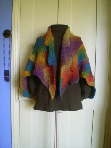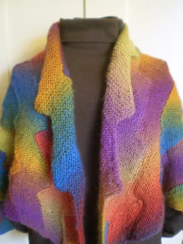 | Skøn mangefarvet jakke i retstrikning med zigzagmønster. På ryggen ligner det lyn (se nederste billede). Her strikket i uld med nylon på pinde 4 mm. |