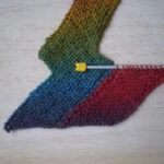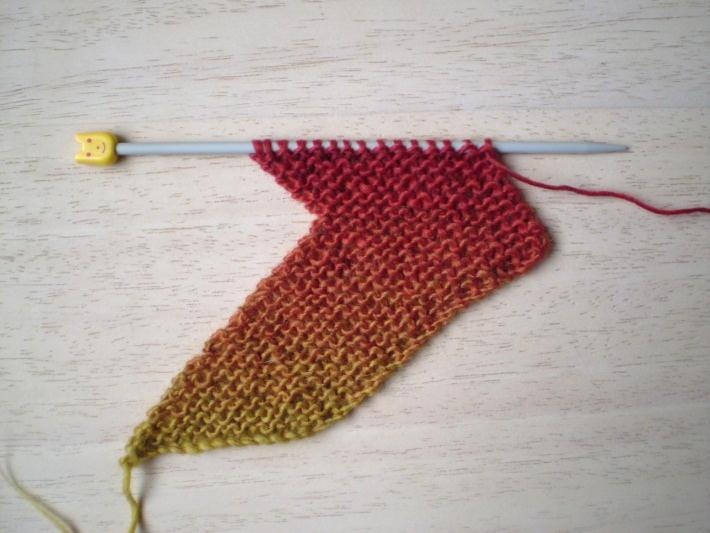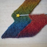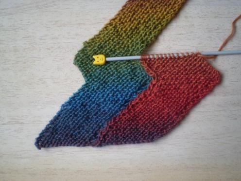 - Strik lige så mange hele zigzag’er, som du gjorde til første halvdel af strimlen, men strik kun 14 retriller af den sidste zag, før du strikker vendingen til næste strimmel: