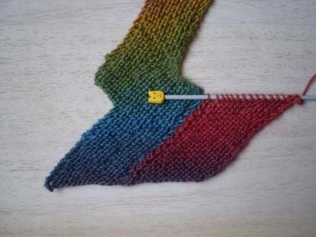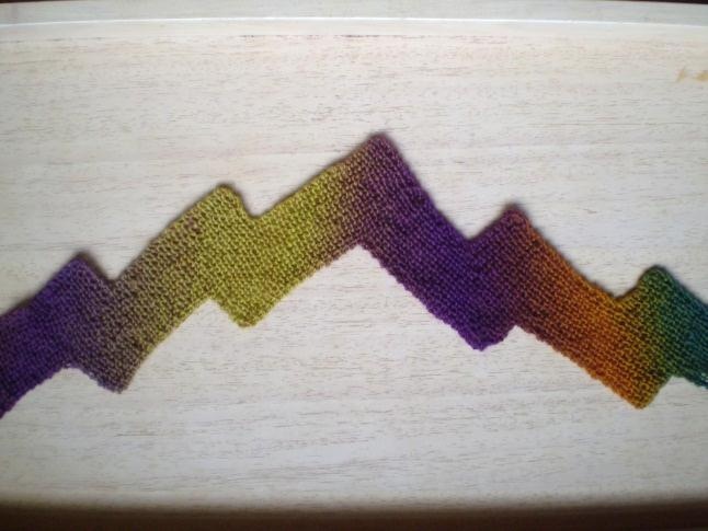 Dette sjal er en variation af mit mønster til Zigzagtæppe 1 (ligger her på Strikkeglad). Smalle, retstrikkede strimler i zigzagmønster strikkes sammen efterhånden vha. regelmæssige udtagninger og indtagninger. Jeg har brugt strimler på 15 m i et uregelmæssigt mønster, så det passer rundt om halsen og danner en spids midt bagpå.