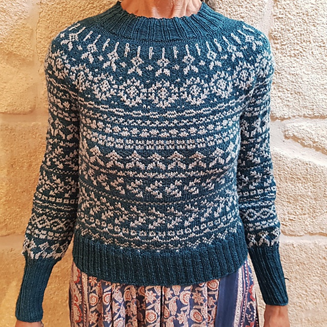 Coline er en sweater i mønsterstrik med bærestykke, der strikkes ovenfra. Der er geometriske mønstre, som kan laves over hele sweateren eller udelukkende på den øverste del. Den strikkes i mindst 2 farver, og der er diagrammer i 2 forskellige kontrastmønstre.