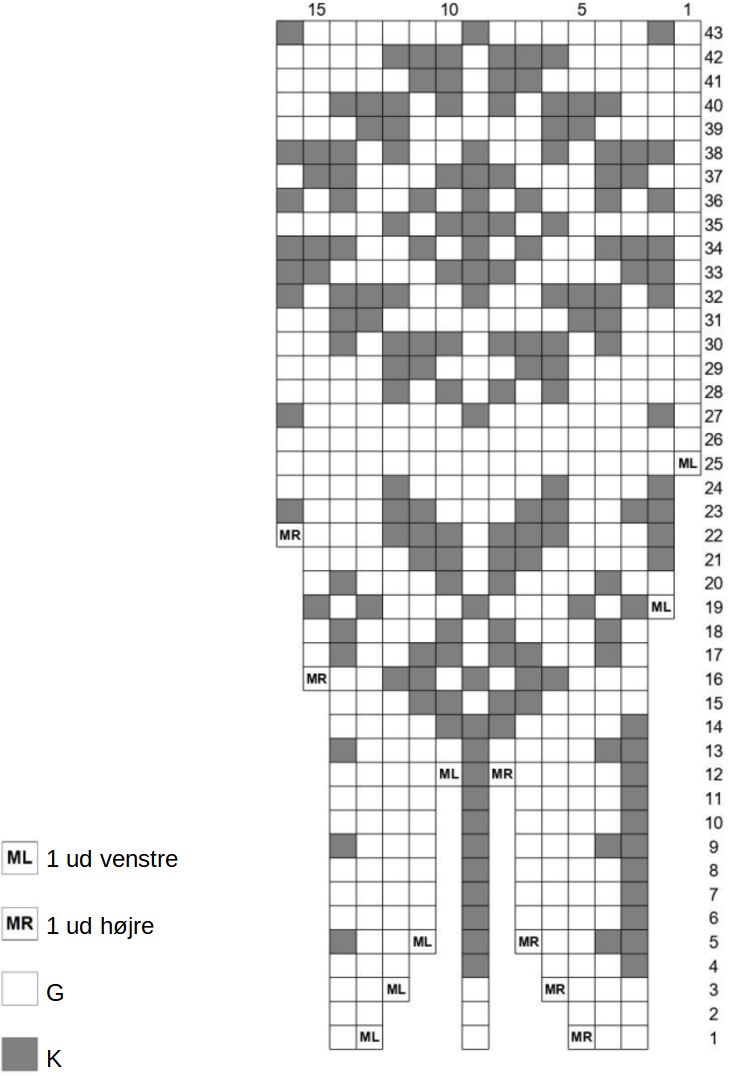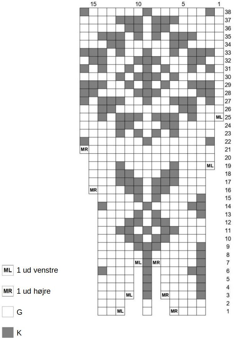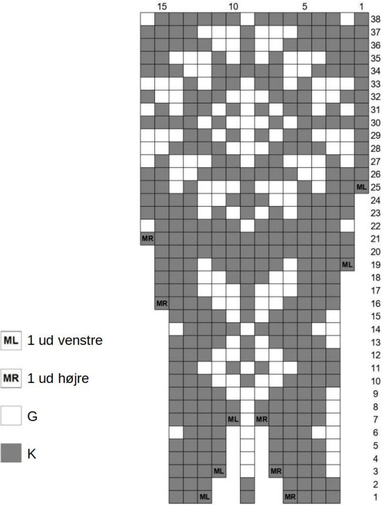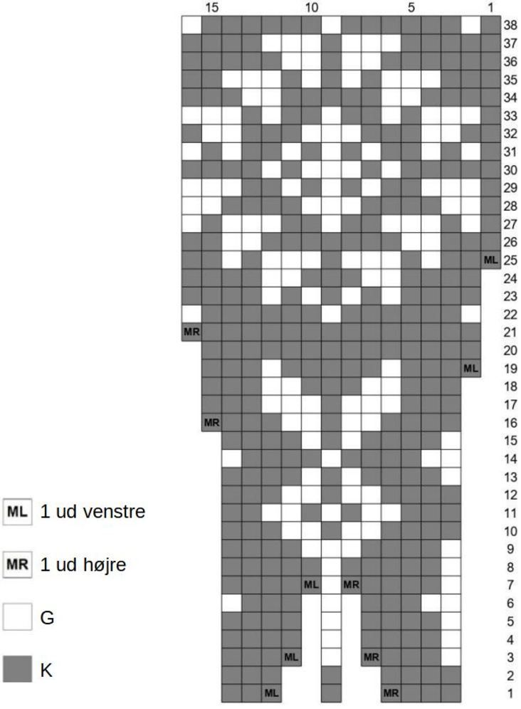 - Til hjælp med at holde styr på gentagelserne kan du sætte markør for hver 6. m på str 1-9 og hver 4. m på str 10-14.