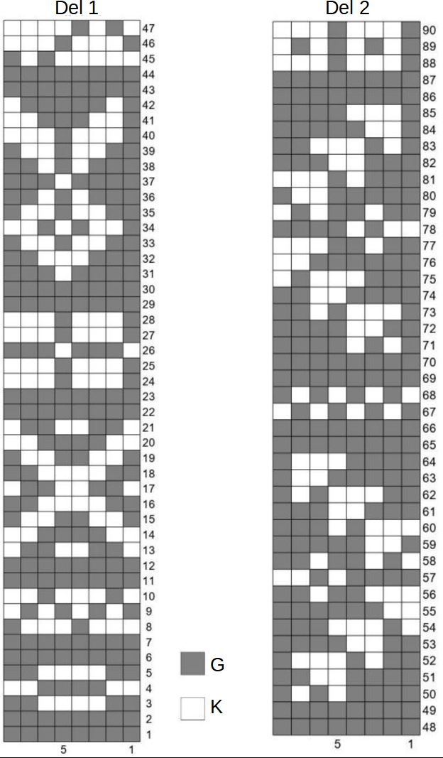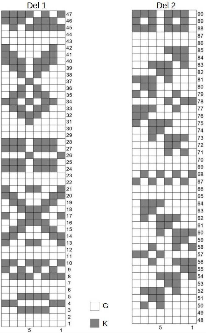 Hvis du strikker mønsterstrik her, skal du strikke frem og tilbage, og mønstret er ujævnt i siderne. Du kan vælge at lave vendepindene i et af de mindre mønstre i diagrammet, hvilket vil gøre overgangen mindre synlig, fx mønstrene fra omg 1-12, 22-30, 43-49, 65-70 eller 86-90.