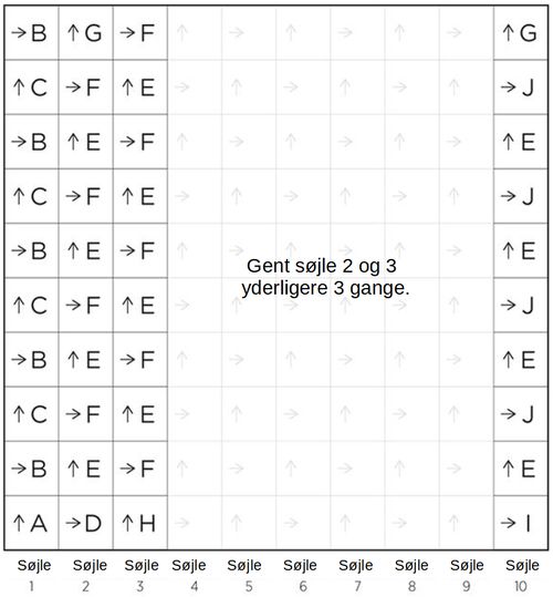 Bemærk, at instruktionerne til firkant A–J er forskellige.