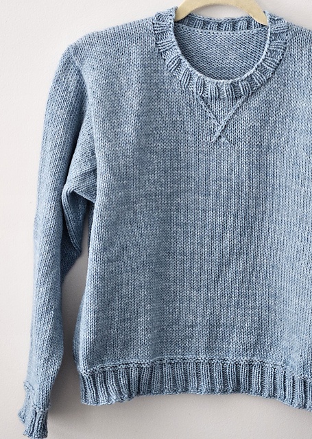 | Dejlig, løs sweater i glatstrikning i 9 størrelser op til 5 XL. Den har en V-detalje i halsen og ribborter forneden og på manchetterne. Her strikket i akryl med uld på pinde 4 og 4½ mm. |