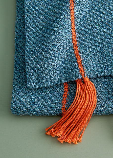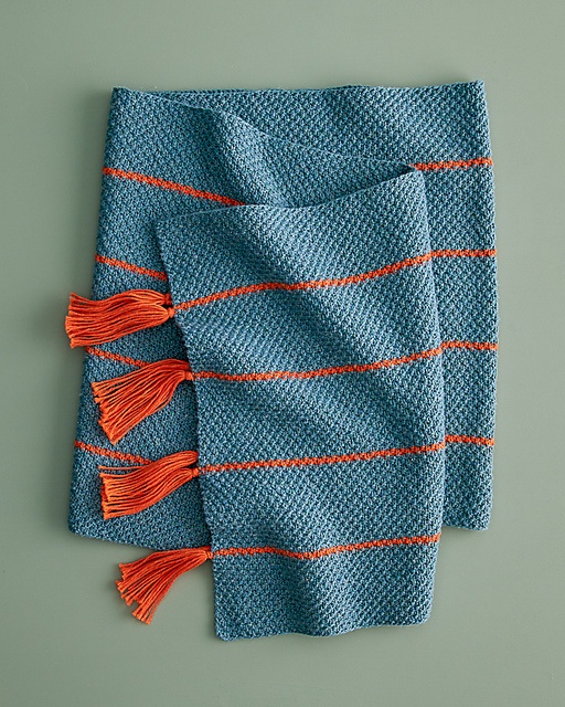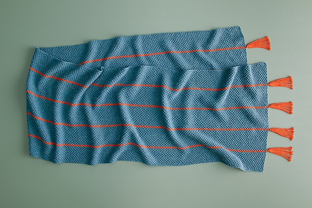 Det strikkes på tværs fra den lange kant, dvs. du slår op til den lange side. Der er små, elegante kvaster i enden af striberne.
