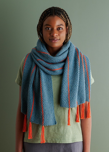 | Sjal eller bredt tørklæde i perlestrik. Strikkes på den lange led. Det har smalle striber i kontrastfarve. Her er det strikket i bomuld, grundfarven med bambus og hør, på pinde 3¼ mm. |