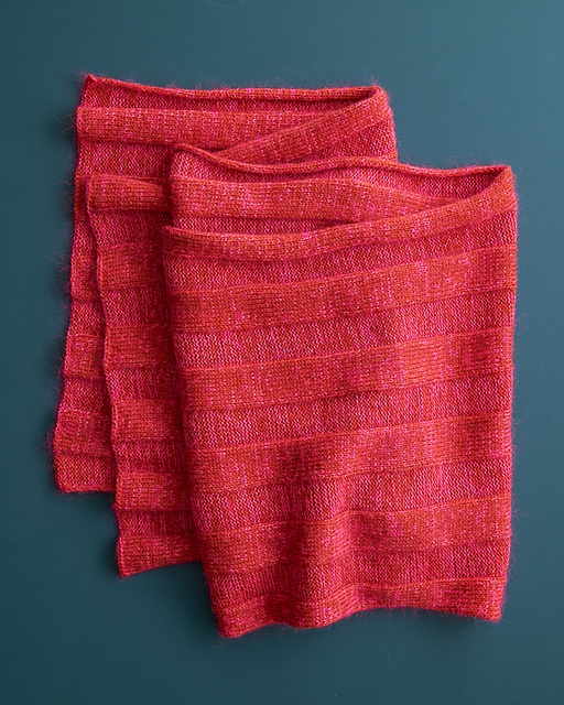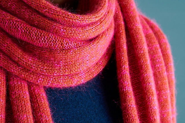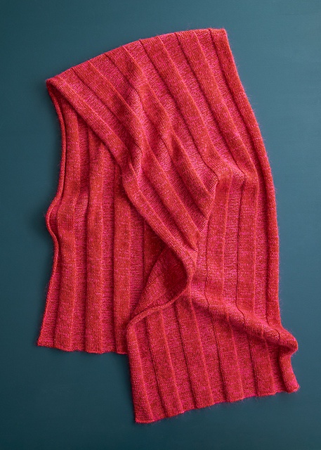 Dette sjal eller brede tørklæde strikkes i ret og vrang af 2 slags garn, der holdes sammen. Der er en kant af masker, der tages løst af. Det er let at strikke, og den brede rib gør, at der er færre skift mellem ret og vrang.