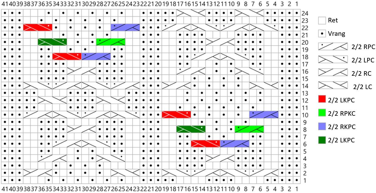 - P 3 (vrangs): 3 r, 2 vr, 4 r, 4 vr, 4 r, 2 vr, 3 r, 5 vr, (1 r, 1 vr) × 3, 1 r, 4 vr, 3 r = 41 m.