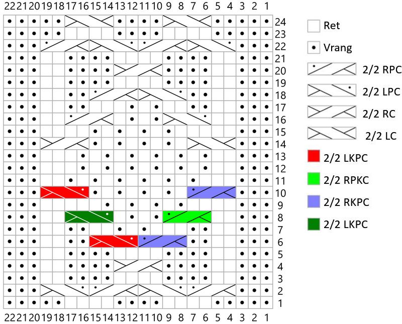 - P 3 (vrangs): 3 r, 2 vr, 4 r, 4 vr, 4 r, 2 vr, 3 r, 5 vr, (1 r, 1 vr) × 3, 1 r, 4 vr, 3 r.
