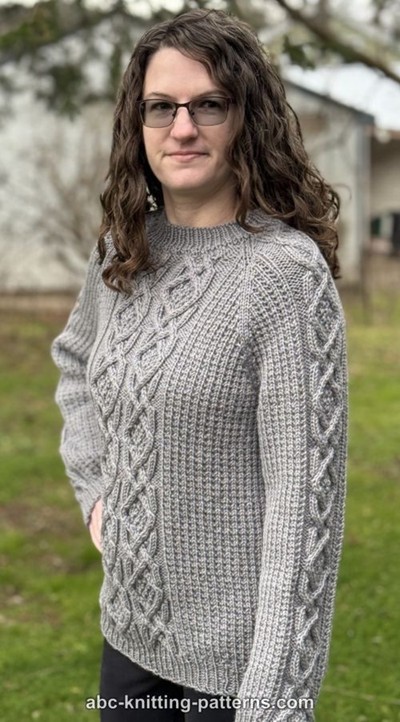 © 2025 Elaine Phillips. Original titel Eternal Braids Cable Seamless Sweater. Kun til personlig brug. Hverken opskrift eller færdigstrikket produkt må videresælges. Kontakt Elaine.