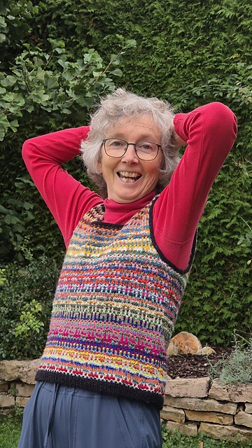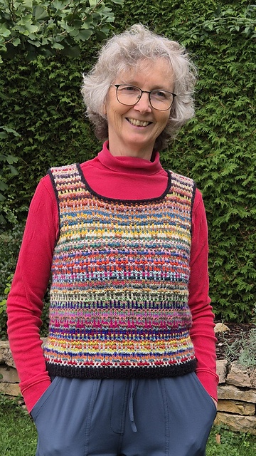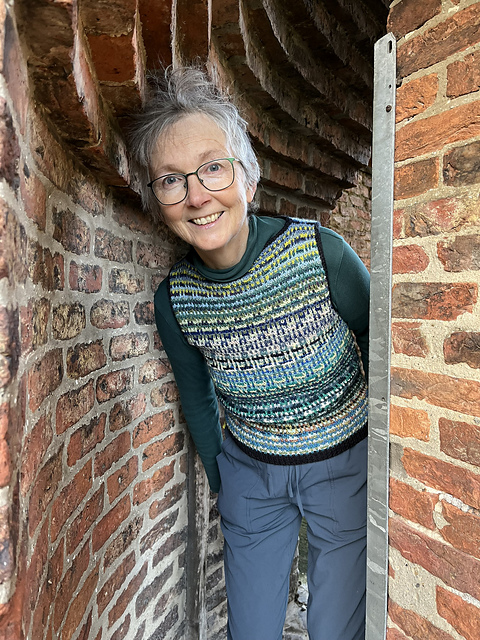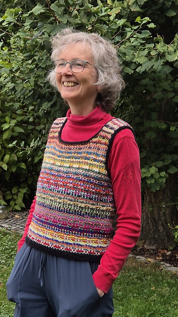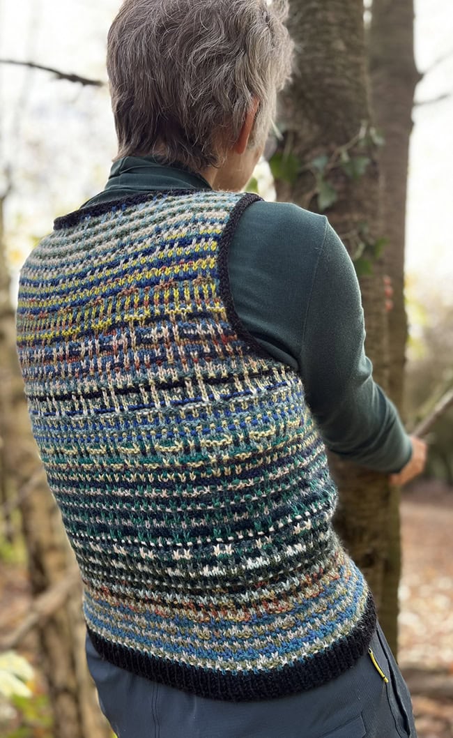 Vest lavet af garnrester i DK weight (eller fingering holdt dobbelt). Den egner sig lige godt til mænd og kvinder og er perfekt som ekstra lag. Den laves af en blanding af forskellige vævestrikmønstre, enten gentaget eller i tilfældig rækkefølge. Fx kan du skifte farve på hver anden pind.