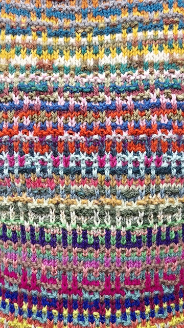 Farveskift: Du beslutter, hvor ofte farverne skal skiftes. Du kan evt. lægge alt dit garn i en stor pose eller kurv, stikke hånden ned og trække et tilfældigt ngl garn ud. Eller du kan arrangere alle farverne, før du starter og strikke gradvise overgange (se fx her), en regnbue eller en helt tilfældig rækkefølge.