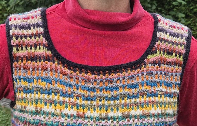 Vesten har enten en firkantet halsudskæring eller en bådformet udskæring. Den firkantede er strikket i alle farver, og den bådformede i rester af grønt, blåt og gråt.