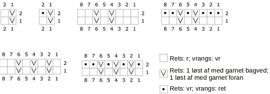 P 2 (vrangs): *2 vr, (1 løst af med garnet foran, 1 vr) x 3*. Gent fra * til * pinden ud.