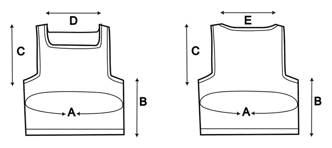 Begge versioner vises i str S med 5 cm bevægelsesvidde over den bredeste del af brystet og 7½ cm bevægelsesvidde i ærmegabet.