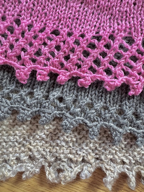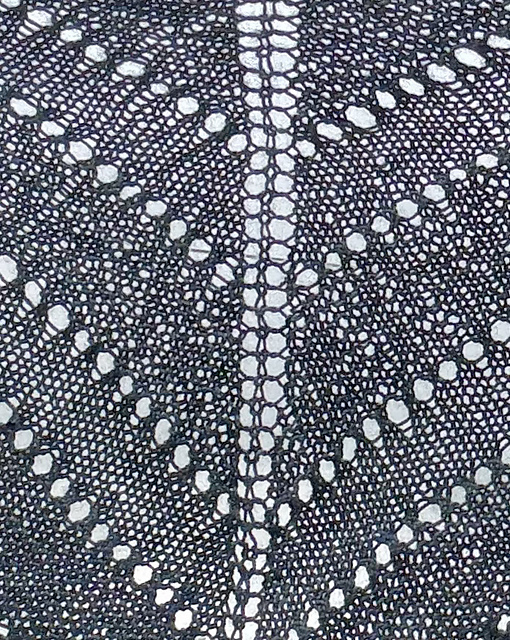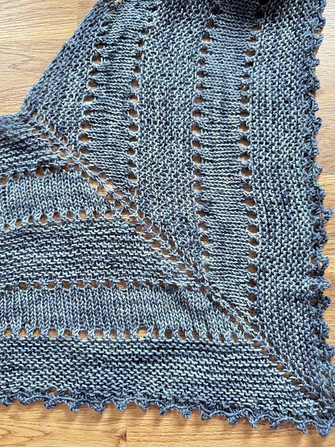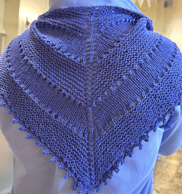 Dette tørklæde strikkes fra midten af den lange, lige kant. Udtagningerne skaber en trekant, hvor aflukningskanten er spidsen af de korte sider. Flere mønsterpaneler kan tilføjes. Flere hulkanter kan tilføjes.