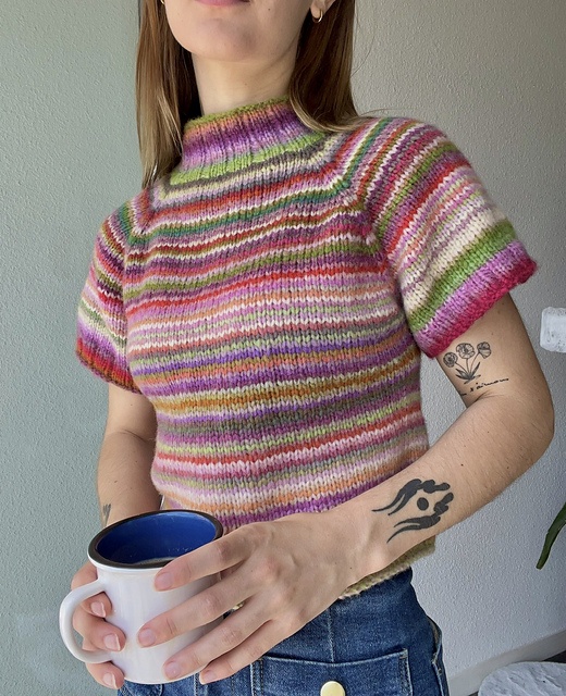 | Kortærmet bluse med raglanærmer i 6 størrelser. Den har en høj krave. Strikkes enten ensfarvet eller med striber. Her strikket i merino på pinde 5 og 6 mm. |