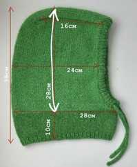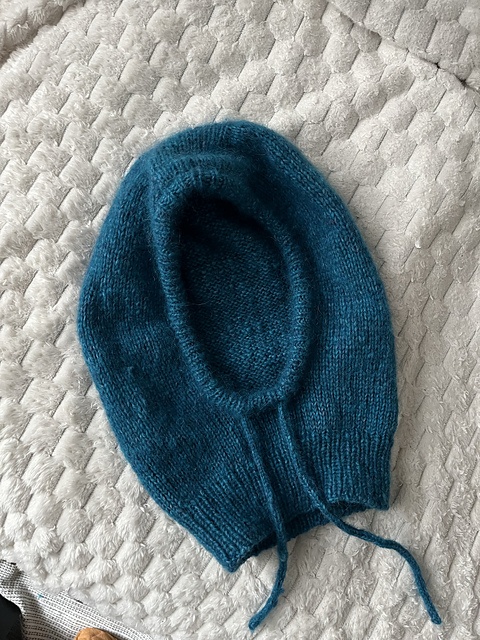 Hætte i balaklava-stil med bindebånd. Den strikkes ovenfra i glatstrikning frem og tilbage, hvorefter der strikkes rundt.