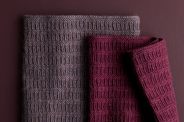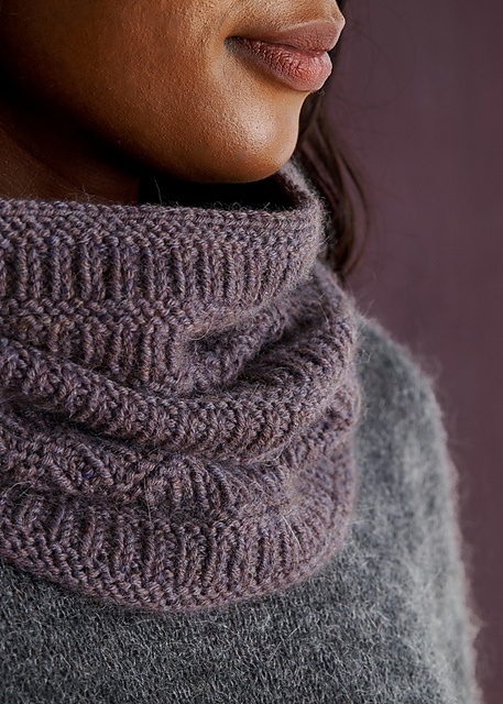 Denne halsvarmer har et mønster i ret og vrang, der består af lodrette ribber og vandrette retriller. Den er nem, helt vendbar og strikkes rundt. Meget velegnet til begyndere.