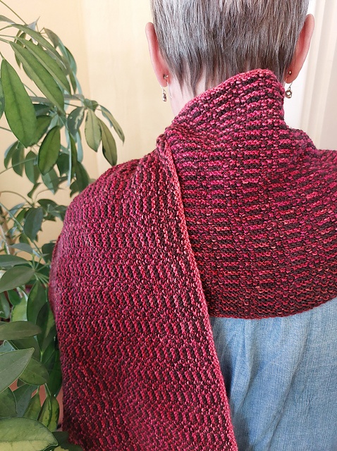 Dette tørklæde har et enkelt mønster med retmasker og vrangmasker, der gentages på lange pinde. Retsiden har vandrette og lodrette striber, og vrangsiden er mere nistret og ser næsten vævet ud.