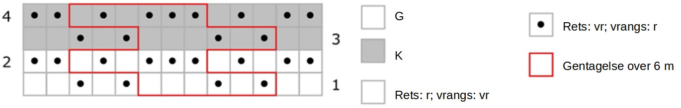 - P 1 (rets): (G) 2 r, (1 vr, 1 r, 1 vr, 3 r) til de sidste 5 m, 1 vr, 1 r, 1 vr, 2 r.