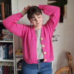 Cardigan i 5 størrelser med raglansømme og ribkanter samt knapper ned foran. Her i 100 % polyester (andet kan bruges) på pinde 3½ og 5 mm.