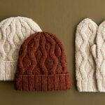 Sæt med hue (4 størrelser) og vanter (3 størrelser) med snoningsmønster. Fra baby til stor voksen. Her i 100 % uld på pinde 4 og 5 mm.